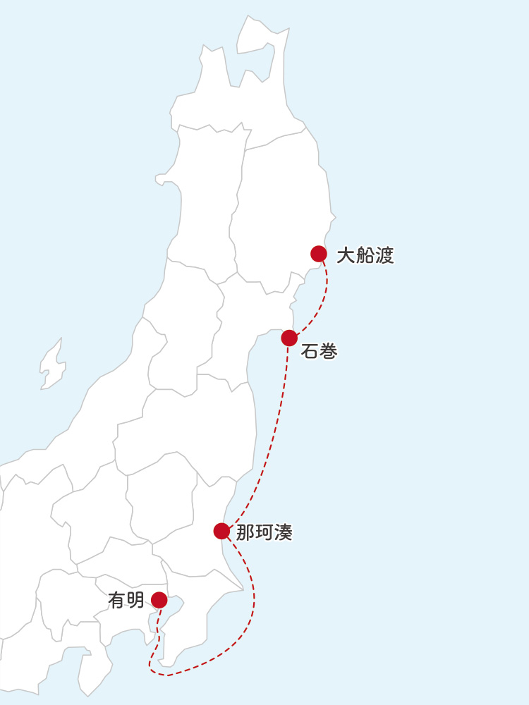 江戸時代、生活物資の輸送が増加する中で、千石船のような大型船が発展しはじめ、気仙丸が運航した「東廻り航路」は、大船渡(東北地方)と江戸を結び、当時の物流の大動脈となりました。