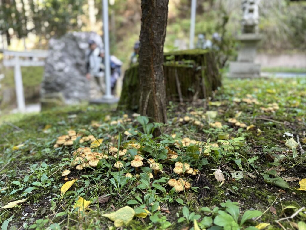 今回のスタートは野々前漁港。舗装された道が山道に変わり、鬱蒼と茂る常緑の木々の中を進みます。最初の立ち寄りスポットは、尾崎山神社。山の中にこんな立派な神社がなぜ?!と驚きますが、漁師の多い海辺のまちには、あちこちに安全祈願の神社や石碑があり、いずれもきれいに手入れがされており、海や山の神様を大切にする習慣が今も変わらず根付いていることがよくわかります。