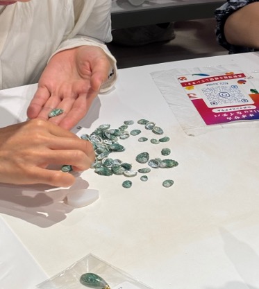 その後のワークショップでは林野火災で被災したあわびの貝殻を使い、世界に一つだけのストラップを作ります。美しい翡翠色の貝殻は小さいものから大きなものまで、色も形もひとつとして同じものはありません。