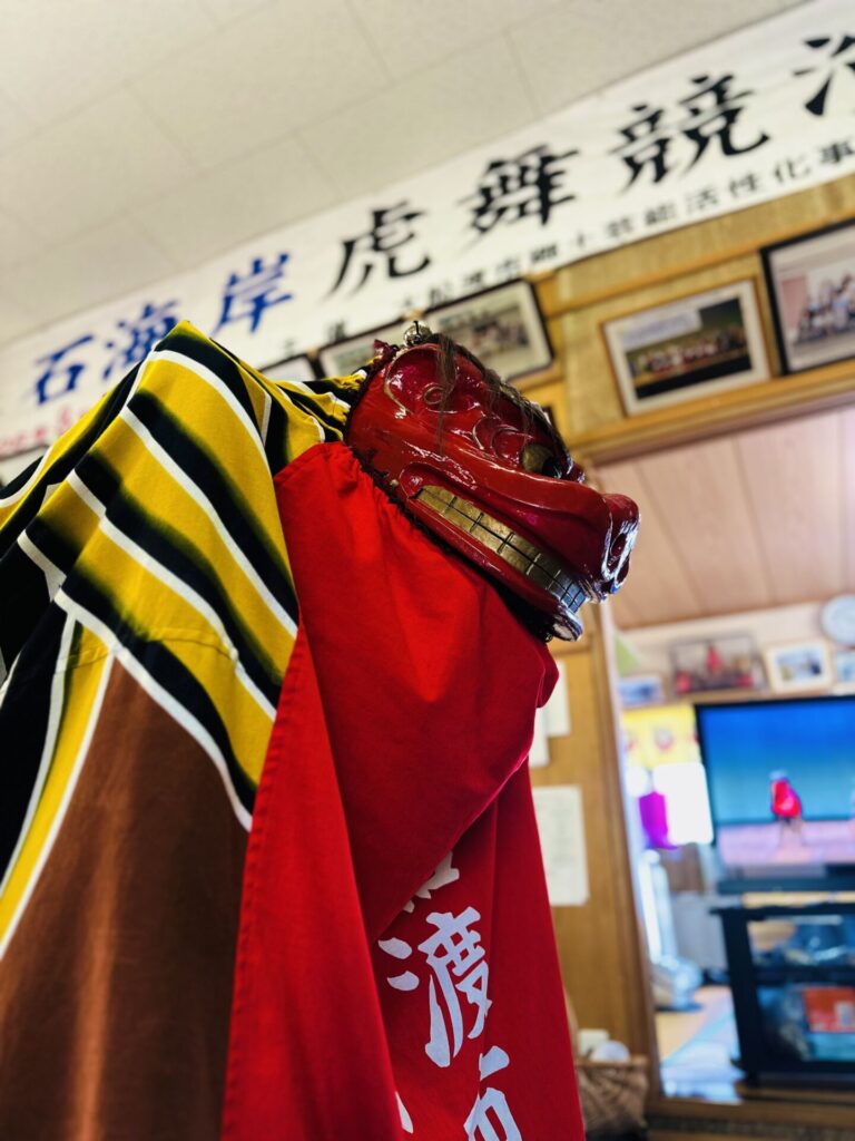 門の浜漁港を後にし、次は休憩場所の「門中虎舞伝承館」へ。普段は地元の有名な門中組虎舞の道具の保管施設を特別に開けていただき、虎舞の演舞者の方のお話を聴きながらおやつタイムです。